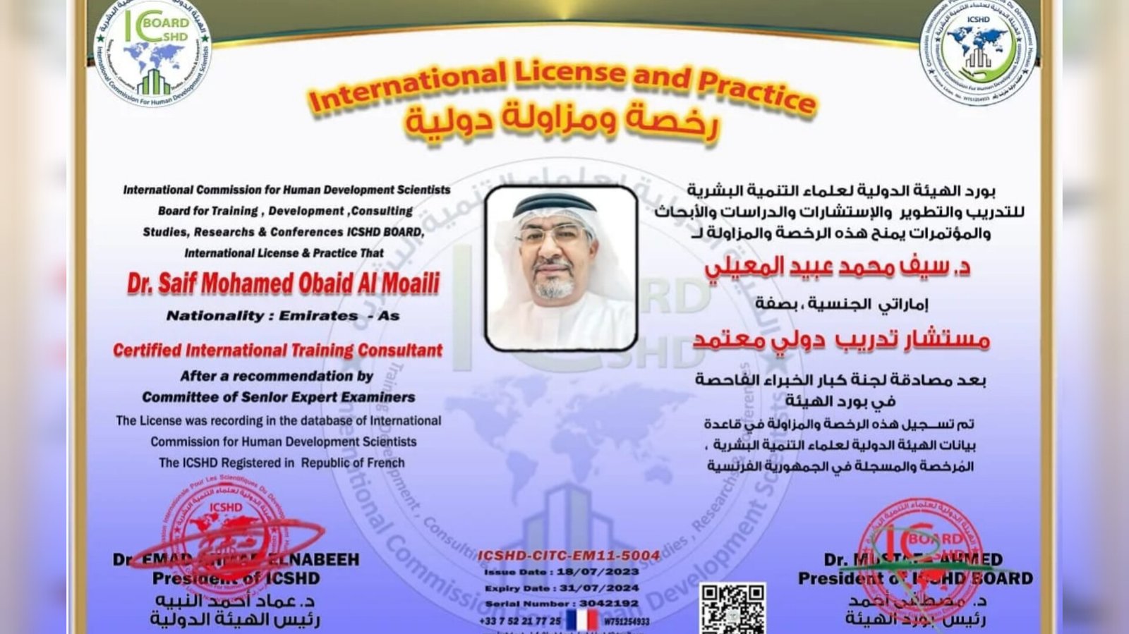 هيئة دولية بفرنسا تمنح المدرب الاماراتي  د سيف المعيلي اعتماد كمستشار دولي معتمد