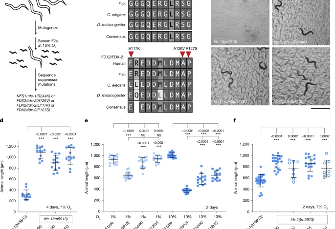 C. elegans were propagated on nematode growth medium plates seeded with Escherichia coli strain OP50 (ref. 50). Some strains were provided by The Caenorhabditis Genetics Center, which is supported by the National Institutes of Health, Office of Research Infrastructure Programs (P40 OD010440). Frataxin frh-1(tm5913) animals were provided by the Mitani Laboratory through the National Bio-Resource Project of the MEXT, Japan. For a complete list of C. elegans strains used in this study see Supplementary Table 2. To generate mutants with CRISPR–Cas9, 30 pmol of S. pyogenes Cas9 (IDT) was injected into C. elegans gonads along with 90 pmol of transactivating CRISPR RNA (IDT), 95 pmol of CRISPR RNA (IDT), ssODN repair template (when applicable) and 40 ng µl−1 PRF4::rol-6(su1006) plasmid was used as a marker of successful injections51.