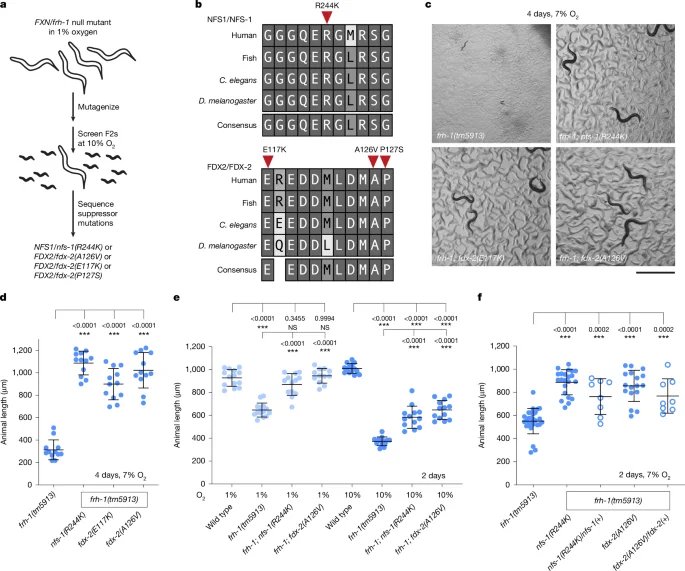 C. elegans were propagated on nematode growth medium plates seeded with Escherichia coli strain OP50 (ref. 50). Some strains were provided by The Caenorhabditis Genetics Center, which is supported by the National Institutes of Health, Office of Research Infrastructure Programs (P40 OD010440). Frataxin frh-1(tm5913) animals were provided by the Mitani Laboratory through the National Bio-Resource Project of the MEXT, Japan. For a complete list of C. elegans strains used in this study see Supplementary Table 2. To generate mutants with CRISPR–Cas9, 30 pmol of S. pyogenes Cas9 (IDT) was injected into C. elegans gonads along with 90 pmol of transactivating CRISPR RNA (IDT), 95 pmol of CRISPR RNA (IDT), ssODN repair template (when applicable) and 40 ng µl−1 PRF4::rol-6(su1006) plasmid was used as a marker of successful injections51.