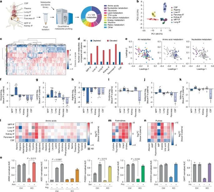 Tissue interstitial fluid was collected from mouse tissues using an adapted protocol based on previous published work52. Female NSG or female B6 mice on ad libitum diet 6–9 weeks of age were used for all tissue interstitial fluid isolations. Organs from five mice were combined per interstitial fluid sample, and each pooled sample was treated as an individual data point for the liquid chromatography–mass spectrometry (LC–MS) measurements and analysis. All mice were euthanized at the same time of day to account for any effects of time of day on metabolism, and were euthanized by cervical dislocation to minimize metabolic artefacts associated with CO2 exposure62. Tissues were kept on a chilled metal block on ice throughout the harvest and when ready to pool, were briefly rinsed in ice-cold saline (16005, Azer Scientific), excess liquid removed by blotting on filter paper (28298-020, VWR), then placed in a 50-ml conical vial lined with a 20-μm nylon mesh filter (148134, Spectrum Labs) and 0.25 μl of 0.5 M EDTA, pH 8.0 at the bottom. The tissues were centrifuged at 400g for 10 min at 4 °C. The flow through was collected and centrifuged again at 400g for 10 min at 4 °C before flash freezing and storage in −80 °C until further analysis. Before tissue harvest, plasma from each live mouse was collected by facial cheek bleed into EDTA-coated tubes (41.1395.105, Sarstedt), then centrifuged at 800g for 10 min at 4 °C. Supernatant containing plasma was flash frozen and stored at −80 °C until further analysis. An equal volume of each plasma sample was pooled from each mouse cohort before analysis by LC–MS.