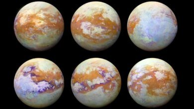 تم إنشاء الصور الستة بالأشعة تحت الحمراء لتيتان أعلاه من خلال تجميع البيانات التي تم جمعها على مدار مهمة كاسيني.…